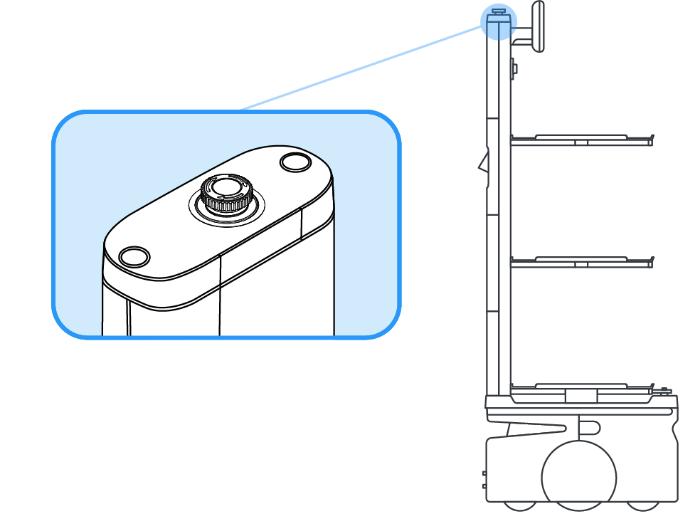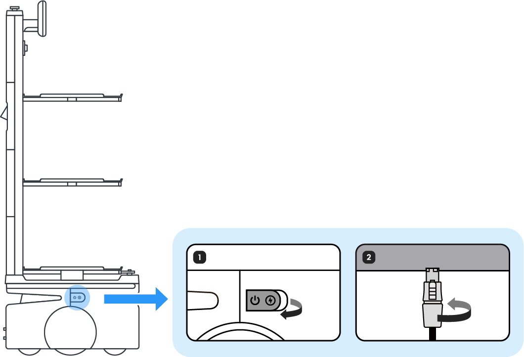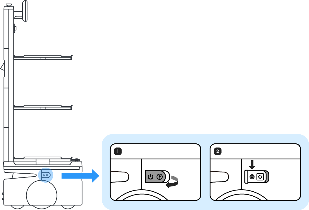 Open the charging cover and press the black power button on the left to turn on the robot.