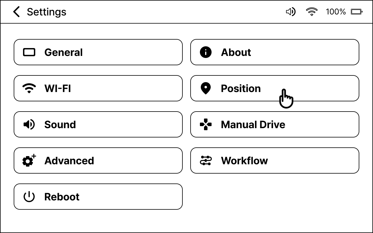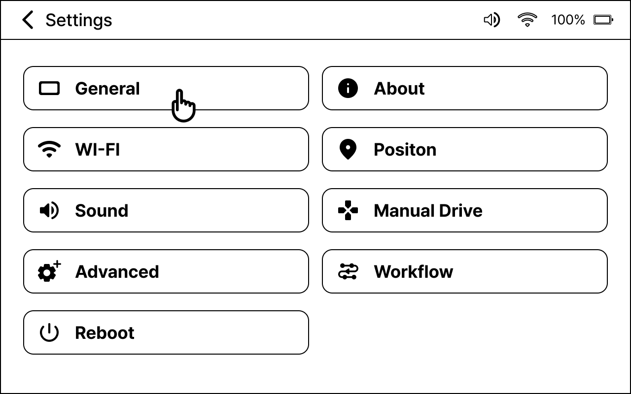 Press and hold the robot name (2-3 seconds) on the left top of the touch screen and go to the Settings screen.