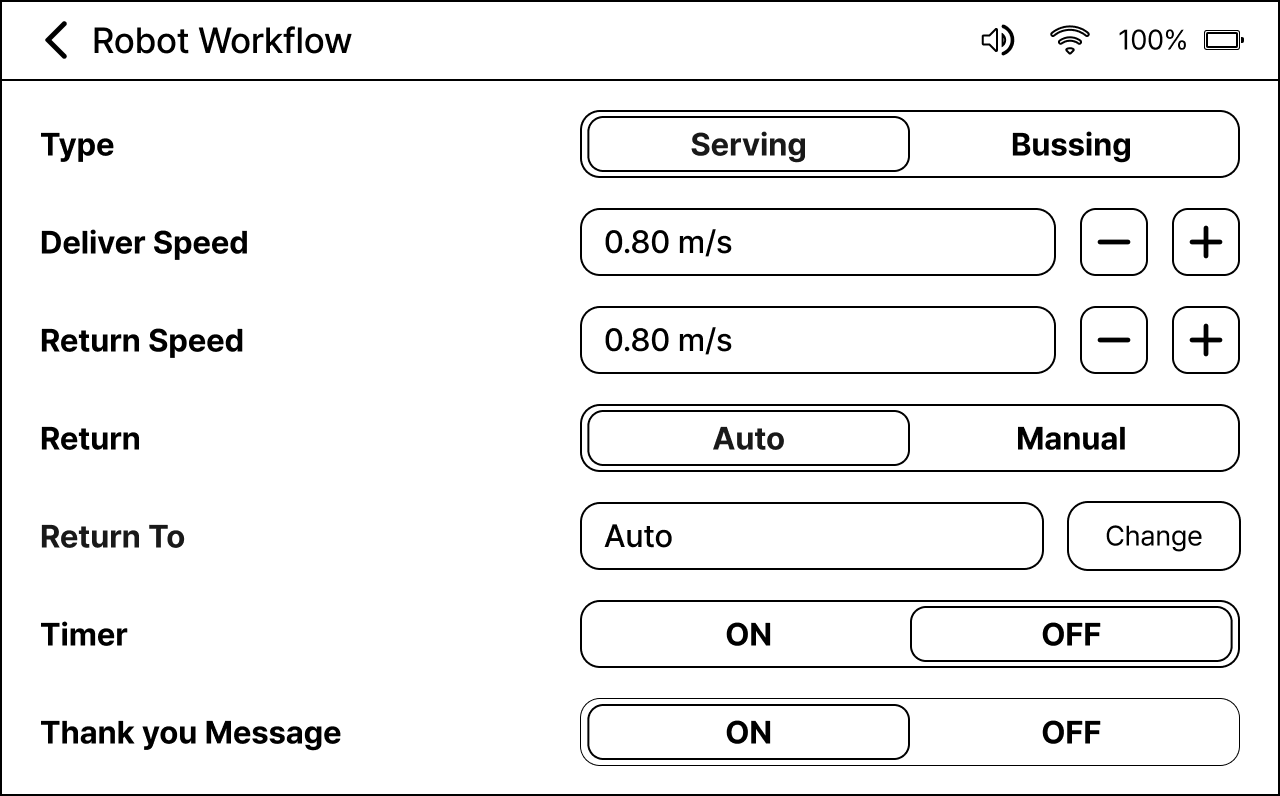 The timer defines how long the robot stays at a destination. To enable the timer, press ON and set Return After. You can turn it off by switching it to OFF.