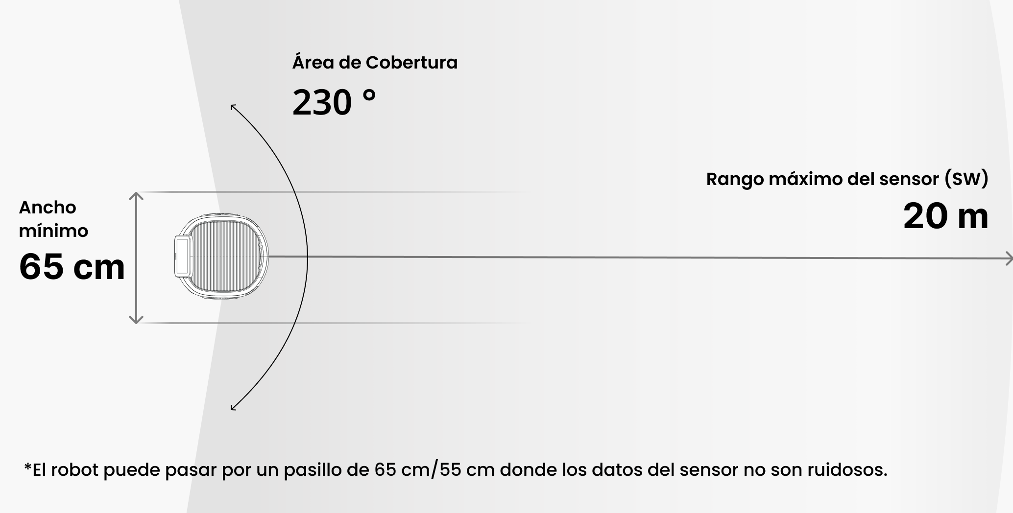 A continuación se indica la cobertura del robot, en la que se incluyen los rangos mínimos de movimiento y de reconocimiento.